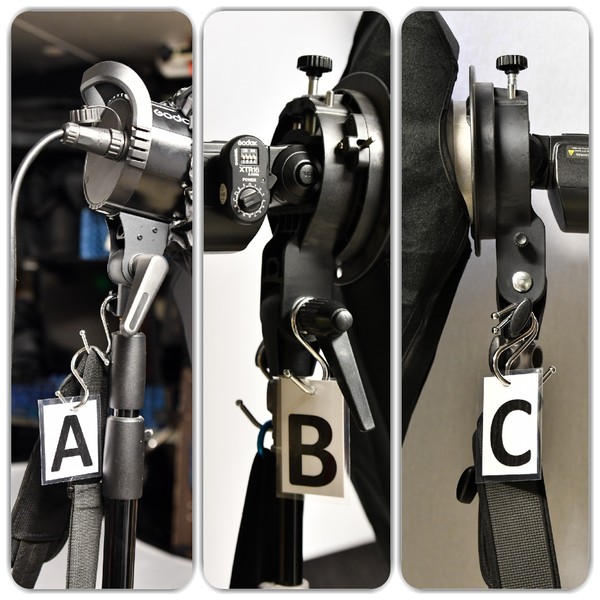 Réponse : Très simple : confectionner des lettres sur bristol plastifié, à accrocher en évidence sur le pied de chaque flash!